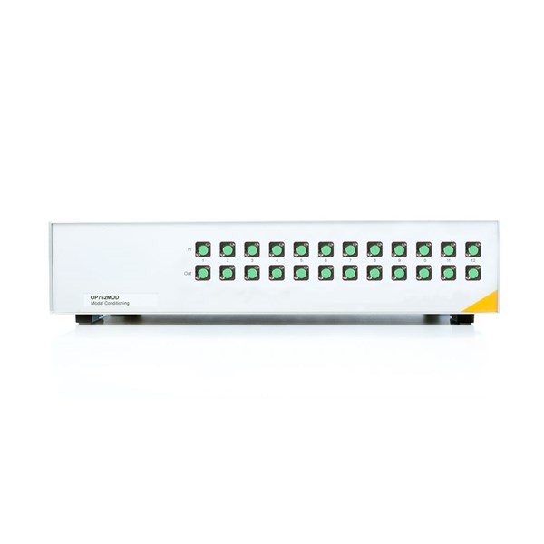 Conditioner, you can quickly meet critical launch condition requirements like Encircled Flux, M80 or 70/70 fill for multichannel test setups. When used in conjunction with the OptoTest Multichannel LED Sources (OP750 Series) or Return Loss Meters (OP940 Series), launch conditions can be met without the need for external mandrel wraps. Each OP752 Modal Conditioner manages launch conditions for up to 12 channels and additional units can be added for 24, 48 and up to 200 channels. Choose from common front panel connectors such as FC and SC with UPC or APC polish. Contact OptoTest or an OptoTest distributor world-wide for additional customizations like unique launch condition requirements.