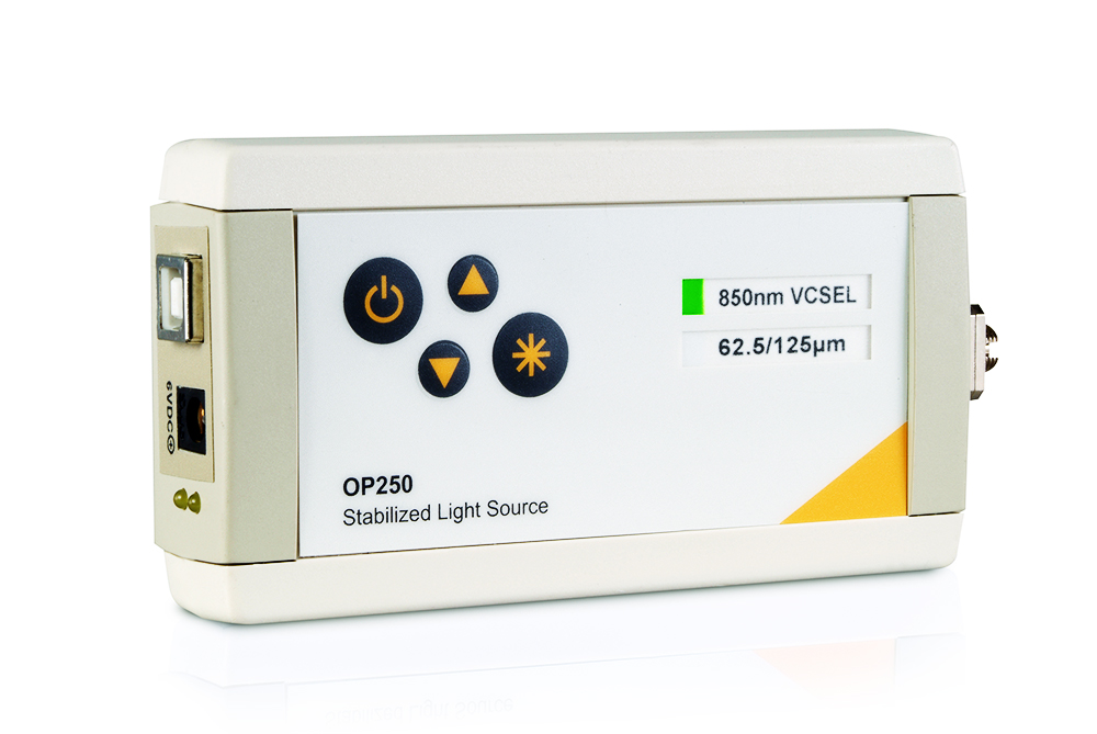 The OP250 is a configurable stabilized light source available with a variety of LASERs or LEDs. Offered in a single or dual port configuration with selectable wavelengths, various power levels and industry standard optical interfaces. This instrument offers all the features and functions necessary for the development, testing and inspecting of optical components and cables. The stand-alone, internally powered module also connects to a USB port on any computer.