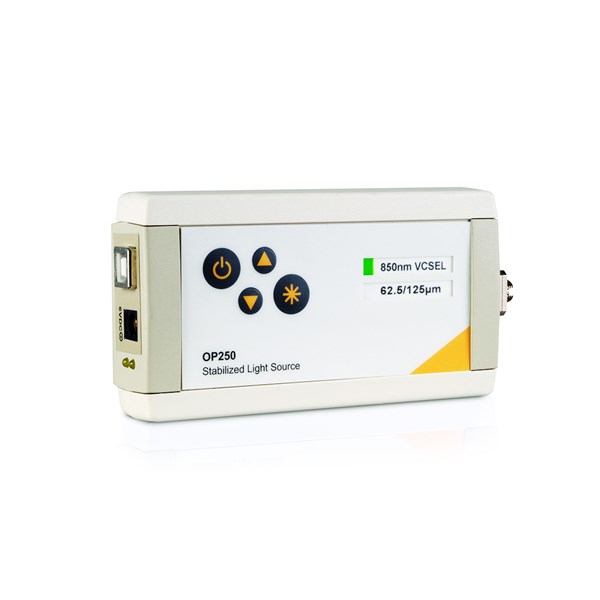 The OP250 is a configurable stabilized light source available with a variety of LASERs or LEDs. Offered in a single or dual port configuration with selectable wavelengths, various power levels and industry standard optical interfaces. This instrument offers all the features and functions necessary for the development, testing and inspecting of optical components and cables. The stand-alone, internally powered module also connects to a USB port on any computer.