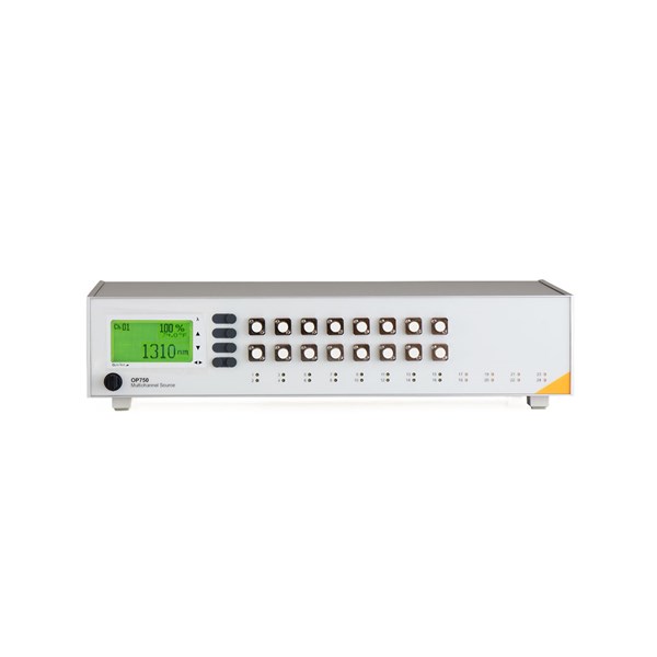The OP750 multichannel source can be configured with a mix of up to 24 individual or switched LED or LASER sources. Single wavelength LED source, available in 850nm or 1300nm, features an internal large core fibre to guarantee an overfill condition for 62.5/125µm or 50/125µm multimode fibre. The single wavelength sources at 1310nm and 1550nm are terminated with standard 9/125µm fibre. A dual wavelength option, such as 1310nm and 1550nm, into a single port is available as well (12 channel version only). To create dual wavelength operation on any channel, an optical switch can be included in the configuration, and represent a great cost savings.